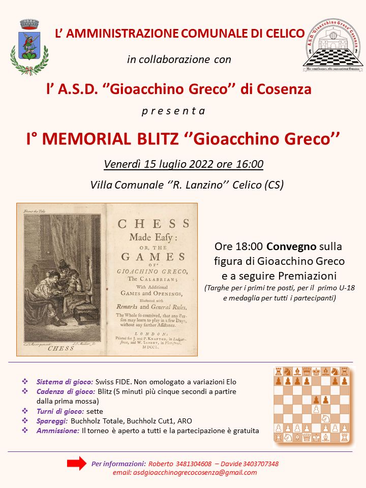 Con la cerimonia di premiazione tenutasi venerdì 15 luglio, alla presenza del sindaco Matteo Lettieri e del presidente del Consiglio Comunale di Celico Mario Scalise, si è concluso nella villa comunale R. Lanzino il I° Memorial Blitz Gioacchino Greco. L’evento, è stato promosso dall’Amministrazione Comunale di Celico in collaborazione con l’A.S.D. Gioacchino Greco di Cosenza. La manifestazione ha richiamato un cospicuo numero di iscritti provenienti dalla provincia di Cosenza e non solo, che per un giorno si sono sentiti come tanti cavalieri erranti al pari dell’illustre Gioacchino Greco.